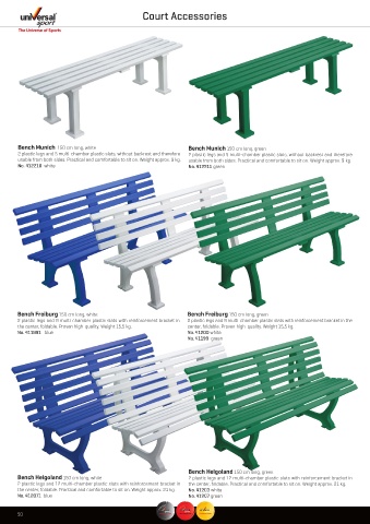 2 plastic legs and 12 multi-chamber plastic slats with reinforcement bracket in the center, foldable. Practical and comfortable to sit on. Weight approx. 21 kg.